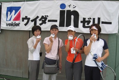 雨のため、開会式はドームで行われれ勢濃支部長挨拶、 レフェリー北さんより競技ルールなどの説明ののち、試合スタート。 心配していた雨も昼前にはあがり、夕方6時近くまで熱戦が繰り広げられました。 ウイルソンのウェア着用のペアに、 ウイルソン賞が贈られるとあって、みなさんウェアにも気合が入ります。 参加者には、ウイダーinゼリーがプレゼントされ、試合の合間や観戦時においしくいただきました。また、全員ピンクリボンのバッジを付けて参加。乳がん検診の意識を高める良い機会となりました。また、 エイボンプロダクツ株式会社様より、エイボン賞、ベストスマイル賞として化粧品やオーデコロンなどが当たる抽選会も行われ、会場は一日、熱戦と熱気であふれました。 |